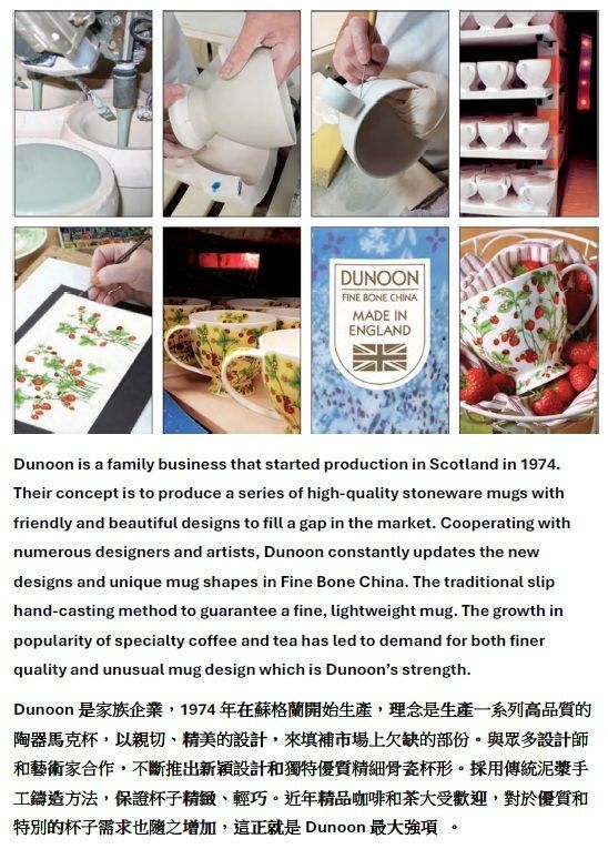 Dunoon fine bone china mugs are handcrafted in Staffordshire, England. They are produced to the highest quality using traditional methods which have been developed and refined over 3 family generations in the pottery industry.
