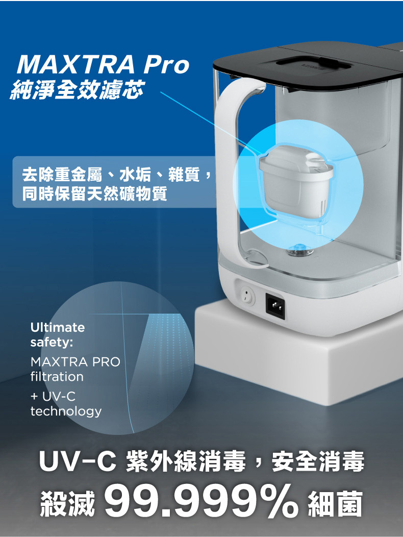 • 先濾再殺 - MAXTRA Pro 濾芯4重精濾+最強UVC殺菌99.999%
